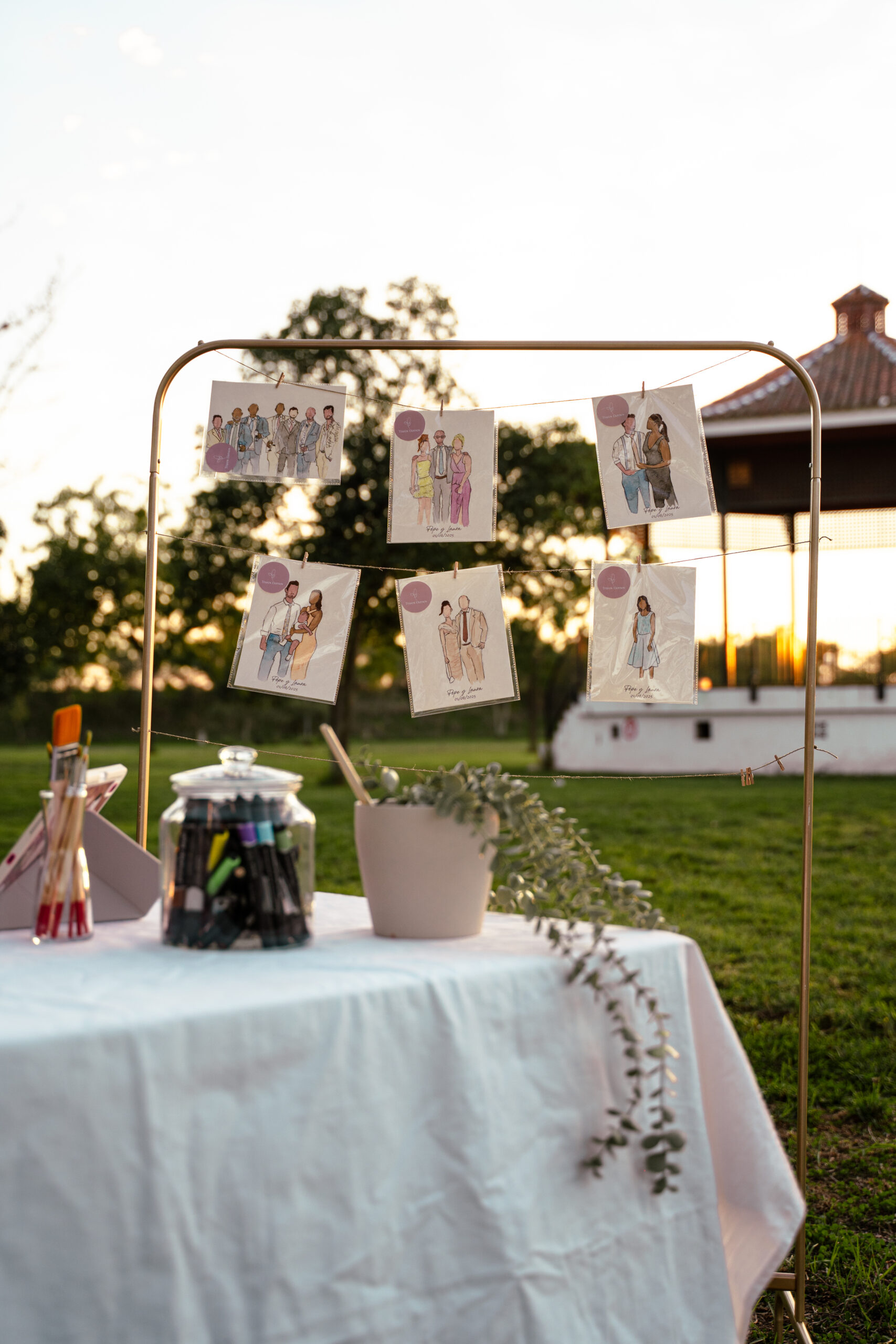 Llego con todo mi material, monto mi rincón artístico, pinto en directo y cada invitado se lleva una ilustración única, hecha a mano, para recordar tu día.